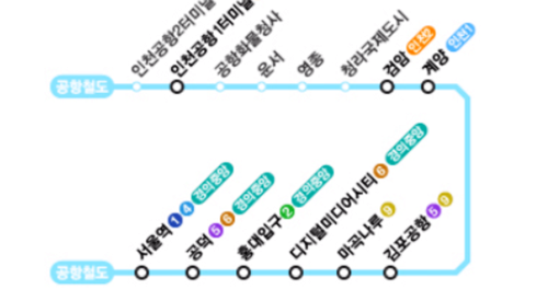 서울역-공덕-홍대입구-디지털 미디어시티-마곡나루-김포공항-계양-검암-영종-운서-화물청사-1 터미널-2 터미널입니다.