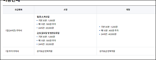 기본요금: 첫 30분 2,400원/이후 30분마다 1,200원씩 추가 (최대요금: 1일 25,000원)