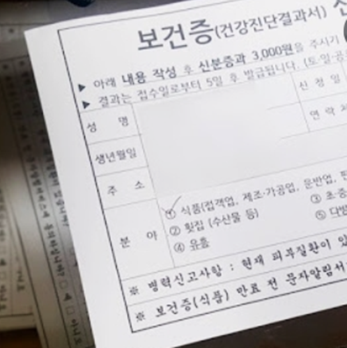 보건증 검사 항목: 장티푸스, 흉부촬영, 전염성 피부질환, 세균성 이질