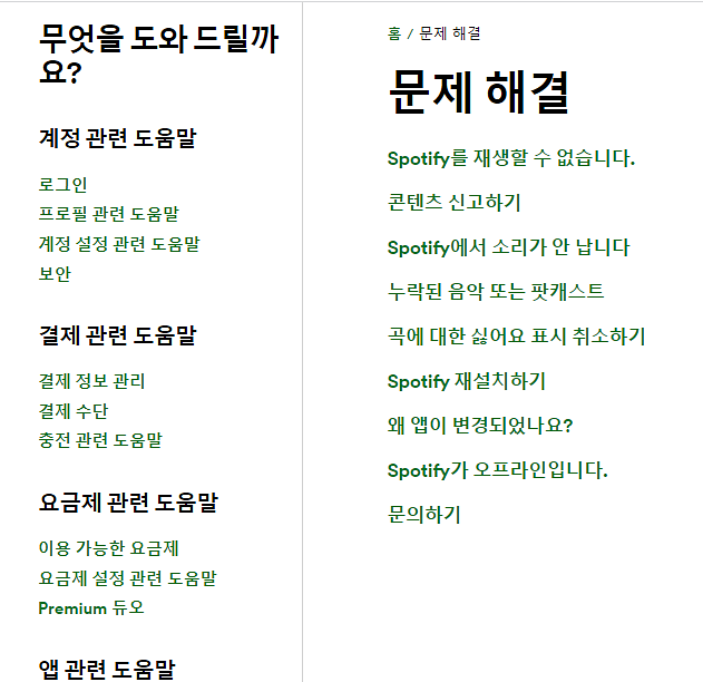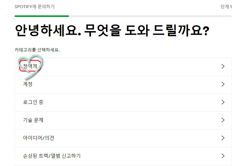 1. 스포티파이 홈페이지에 접속한 후 로그인을 합니다. 2. 상단에서 지원 메뉴를 선택한 후 문제 해결을 선택합니다. 3. 문의하기:문제 해결 페이지 하단에 문의하기를 선택하고 채팅이나 이메일에서 문의 양식 가기 클릭 4.카테고리 선택:정액제 선택 하고 요금과 관련하여 도움이 필요합니다 클릭