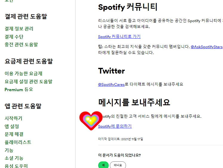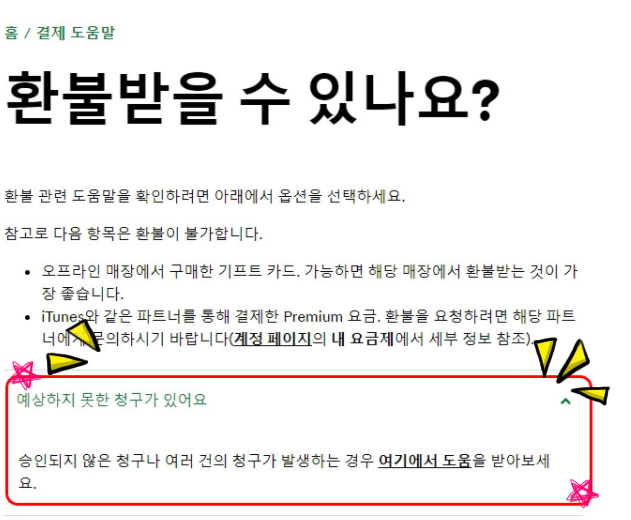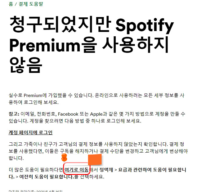 *또는 지원 메뉴에서 무엇을 도와드릴까요 검색창에 환불이라고 입력-검색 결과에 환불받을 수 있나요? 항목 이동한 후 예상치 못한 청구가 있어요 항목 클릭-청구되었지만 spotify premium 사용하지 않음 항목-여기로 이동 클릭합니다.