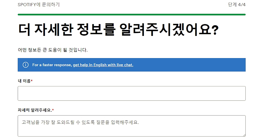 5. 여전히 도움이 필요합니다를 선택합니다.-사용자 이름과 아이디를 미리 복사해 두면 도움이 됩니다. 6. 라이브 채팅:스포티파이는 이메일이나 라이브 채팅으로 상담을 해야 하고 영어로 진행이 됩니다. get help in english with live chat를 클릭합니다.