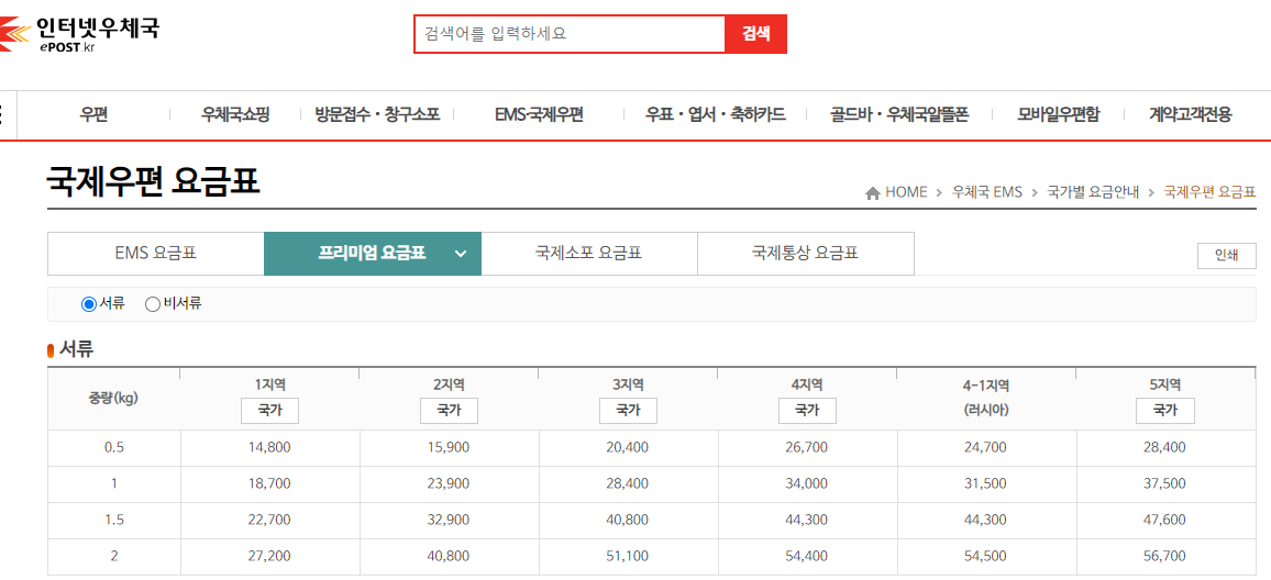 EMS-국가별 요금안내-EMS/프리미엄 요금표