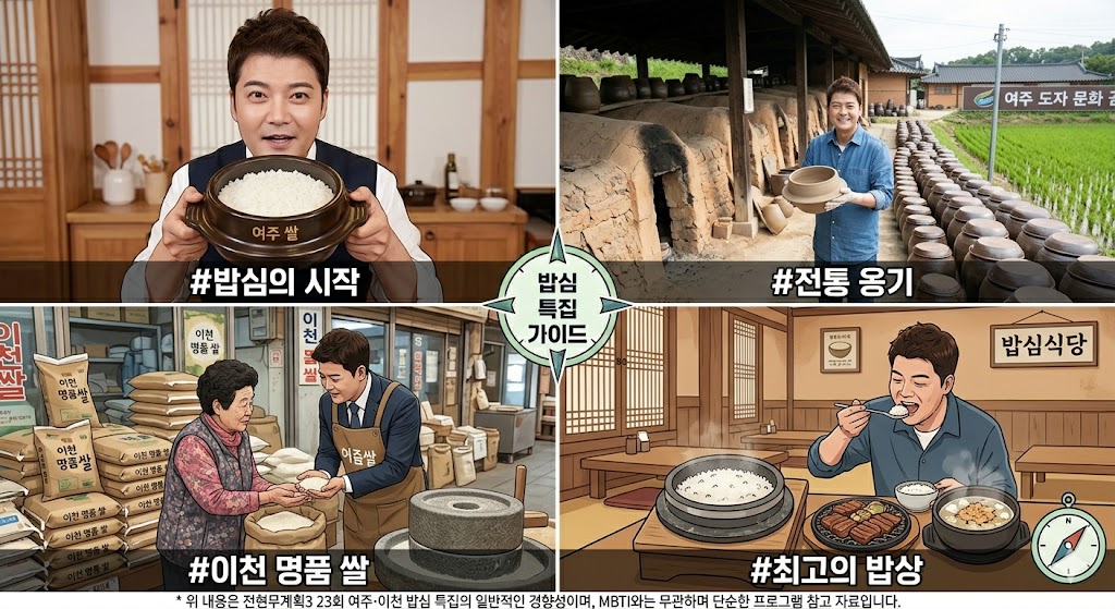 안녕하세요, 럭키예요! 🥰 지난 3월 20일(금) 밤 9시 10분, MBN·채널S에서 방영된 전현무계획3 23회는 정말 배가 고파지는 에피소드였어요! 이번 회차는 무려 '쌀의 성지' 여주 & 이천 밥심 특집이었거든요. 전현무가 "우리가 전현무계획을 3년 넘게 하면서도 '밥이 맛있다'는 말을 잘 안 했던 것 같다"며 드디어 쌀밥의 진수를 찾아 나선 특별한 여정이었답니다!