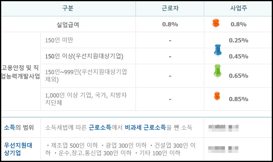 실업급여/근로자 0.8%/사업주 0.8% /150인 미만 기업/사업주 0.25%/150인 이상 우선지원 대상 기업/사업주 0.45%/150인 이상~1,000인 미만 기업/사업주 0.65%/1,000인 이상 기업, 국가 지방 자치단체/사업주 0.85%