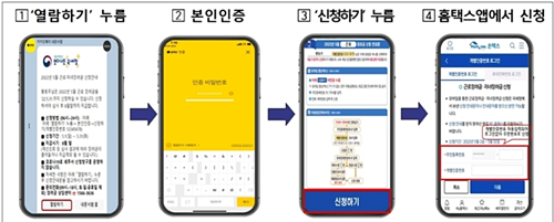 카카오톡이나 문자메시지에 첨부된 안내문을 열람해서 신청하기 버튼을 누름-손 텍스 신청화면-주민번호 뒷자리 7자리 입력-신청 완료