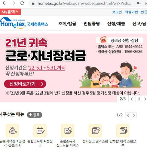 2022 근로장려금 신청은 홈택스 홈페이지에서 신청하면 됩니다. 홈택스 홈페이에 접속해서 신청/제출/근로장려금/신청하기 클릭하면 됩니다.
